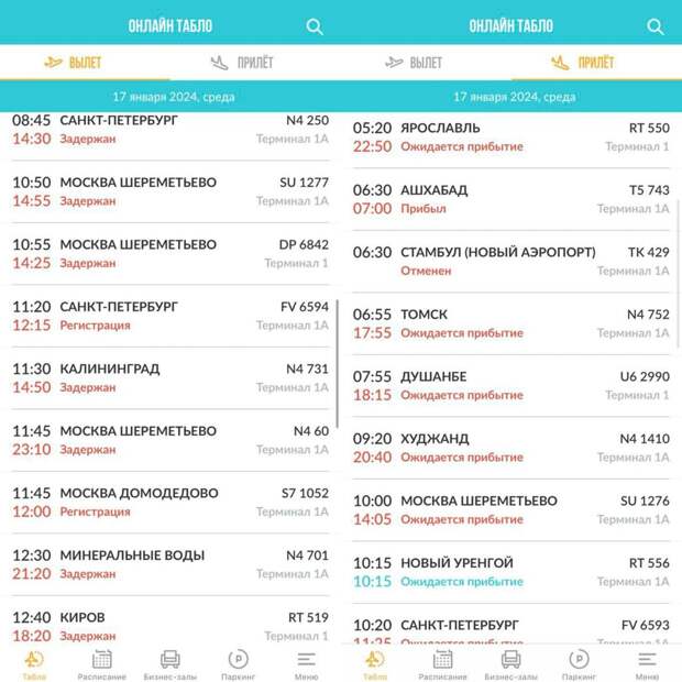 Рейс Казань — Томск задерживается на 11 часов, также задерживаются рейсы в Горно-Алтайск, Москву, Калининград. Ожидается прибытие из Душанбе, Худжанда, Москвы, Нового Уренгоя, Санкт-Петербурга.