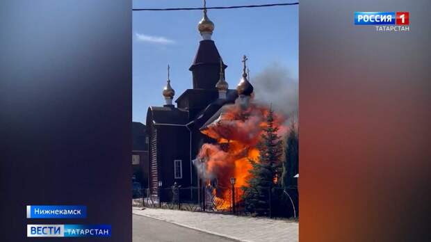 В Нижнекамске сегодня ликвидировали пожар на территории храма Романа Сладкопевца. Горела колокольня. На место экстренно съехались все службы. Уже известно, что ее будут восстанавливать. Подробности у Эльмиры Исмагиловой. Пламя окутало бревенчатую колокольню за считанные секунды. За 6 минут – 32 человека и 9 единиц техники потушили огонь.