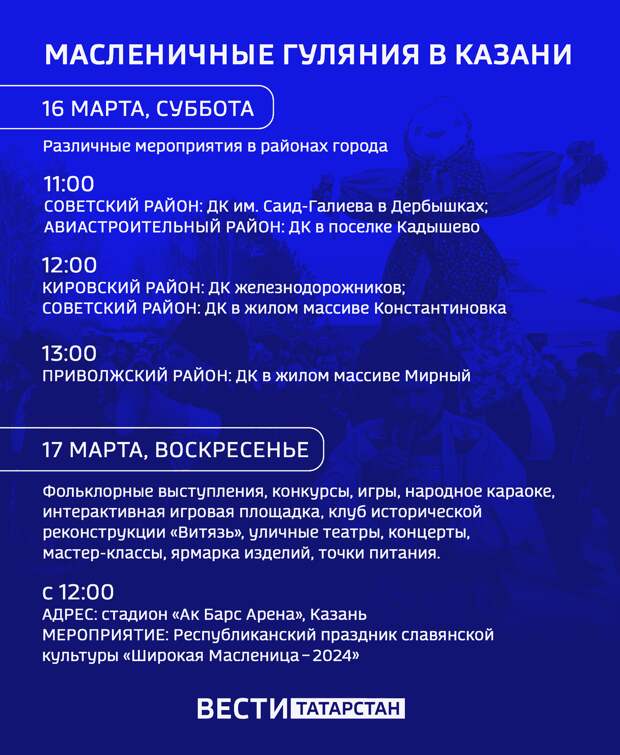 Масленичные гуляния также состоятся 16 марта в различных районах города, включая Кировский, Советский, Авиастроительный и Приволжский районы.