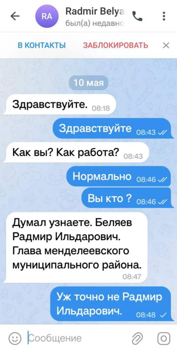 «Спешу предупредить о том, что мошенники снова начали рассылать сообщения от моего имени, создав фейковый аккаунт Telegram. Правоохранительные органы занимаются вопросом», — отметил Радмир Беляев.