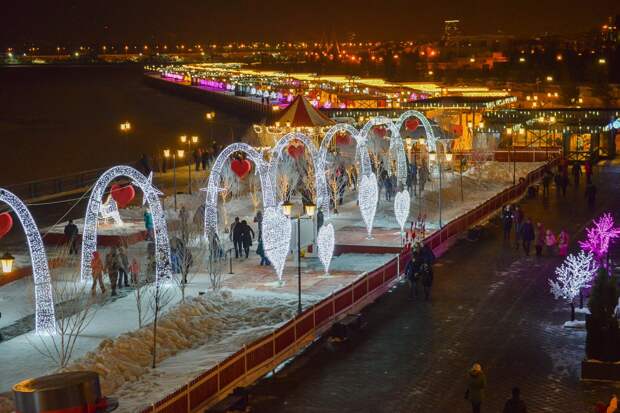 В зимнее время Кремлевская набережная, проходящая вдоль исторического центра, превращается в уютный каток.