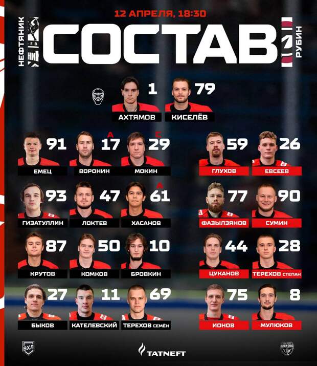 Сегодня в 18:30 по МСК команда «Нефтяник» из Альметьевска сыграет против «Рубина» в шестом матче полуфинальной серии плей-офф Кубка Петрова.