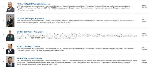 Предварительное голосование продлилось с 20 по 26 мая. В ТОП-5 по итогам голосования вошли также уполномоченный по правам человека в Татарстане Сария Сабурская, Герой России Расим Баксиков, заместитель Председателя Госсовета Марат Ахметов и гендиректор тедерадиокомпании «Новый век» Ильшат Аминов.