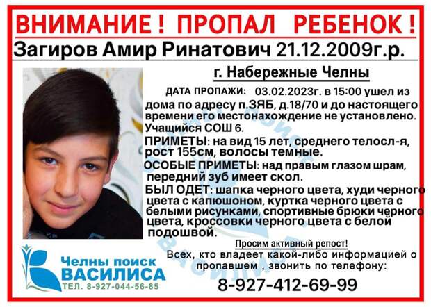 В Набережных Челнах ищут пропавшего 13-летнего школьника. Амир Загиров ушел из дома 3 февраля в районе 15 часов и с тех пор от него нет никаких вестей. Об этом сообщают «Челнинские известия».