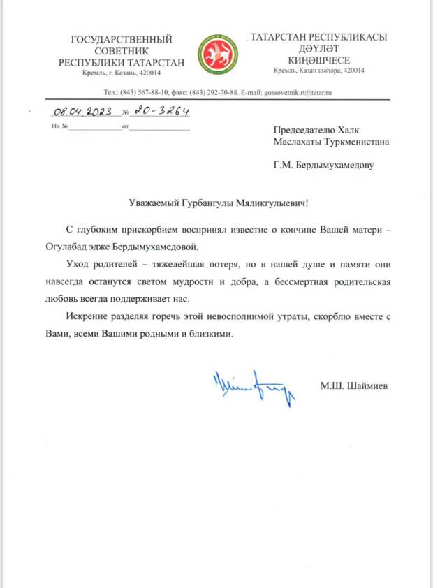 Госсоветник РТ Минтимер Шаймиев выразил соболезнования Председателю Халк Маслахаты Туркменистана Гурбангулы Бердымухамедову в связи с кончиной его матери — Огулабад энже Бердымухамедовой.