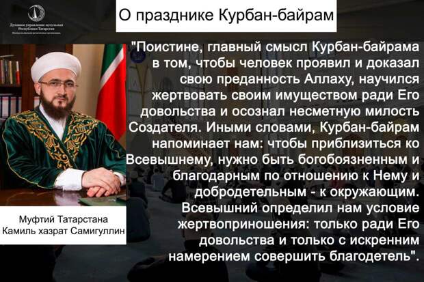 Самигуллин подчеркнул, что Курбан-байрам неразрывно связан с именем пророка Ибрахима алейхисалям. Также его преданность и вера стали причиной того, что мусульмане превозносят этот праздник.