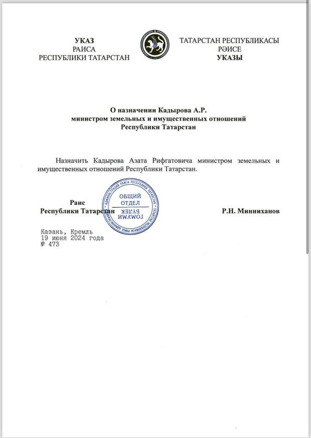 Министром земельных и имущественных отношений Татарстана назначен Азат Кадыров вместо Фаниля Аглиуллина. Соответствующий указ подписал Раис РТ Рустам Минниханов.