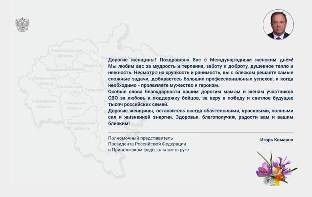 Полномочный представитель Игорь Комаров поздравил женщин с Международным женским днем.