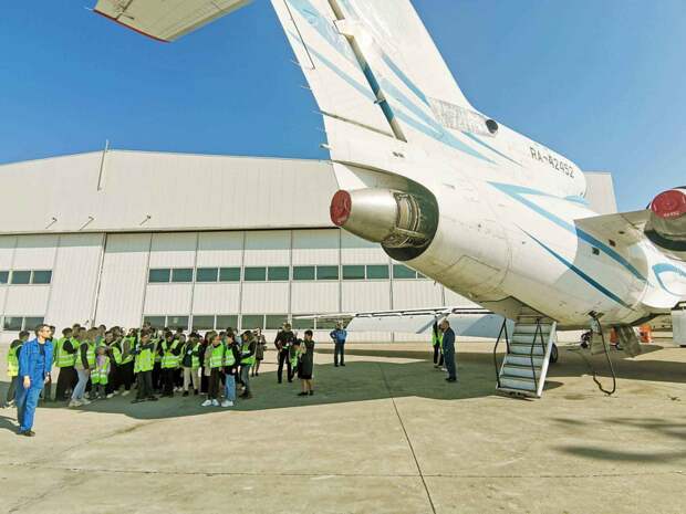 Школьники также посетили летное поле аэродрома и ангар центра по техническому обслуживанию воздушных судов, где им были представлены самолеты Sukhoi Superjet 100 и Як-42.