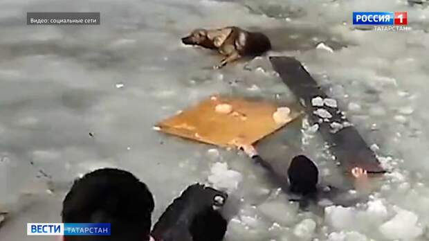 По горло в ледяной воде — отважная пара из Бугульмы спасла из реки собаку, которая провалилась под лёд.