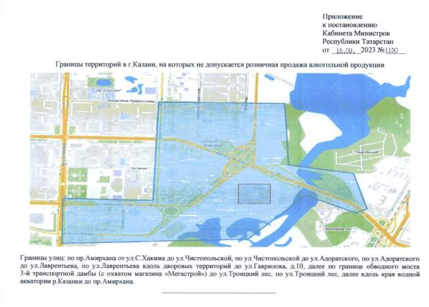 Согласно постановлению, с 17 сентября будет запрещено продавать спиртные напитки на территории, указанной в приложении. Кроме того, запрет распространяется на улицы Астрономическая, Баумана, Кави Наджми, Мусы Джалиля, Профсоюзной, Университетской и Чернышевского.