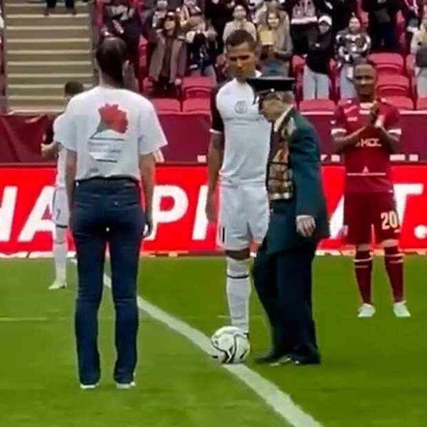 На футбольное поле ветерана проводила волонтер. Под аплодисменты и возгласы болельщиков и игроков Александр Рубенович ударил по мячу.