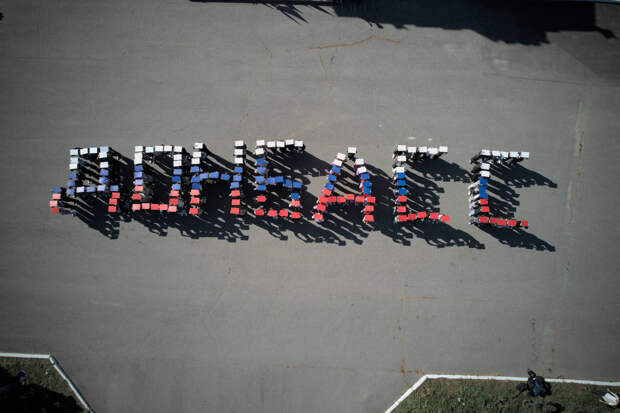 На территории исторического парка «Россия – моя история» более 250 участников, включая молодогвардейцев, студентов и активистов общественных организаций, выстроились в фразу: «Донбасс, Россия – вместе навсегда», держа таблички в цветах российского флага.