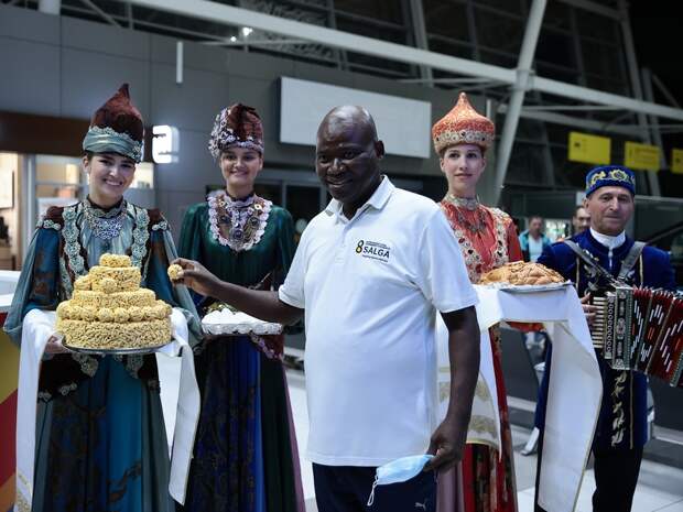 В аэропорту делегации из Южно-Африканской Республики и Индии встретили под мелодии татарской плясовой на гармони. Девушки в национальных костюмах предложили традиционные угощения – хлеб и чак-чак.