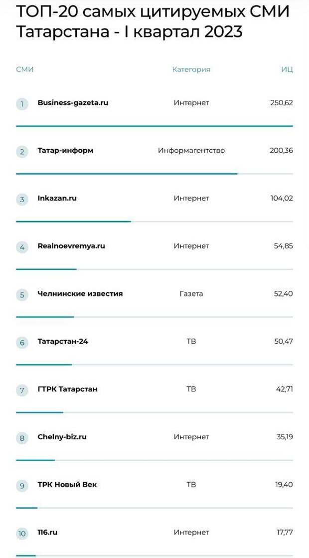 В него вошли 20 СМИ республики. Основой для построения рейтинга стал Индекс Цитируемости «Медиалогии». У ГТРК Татарстан этот показатель составляет 42,71.