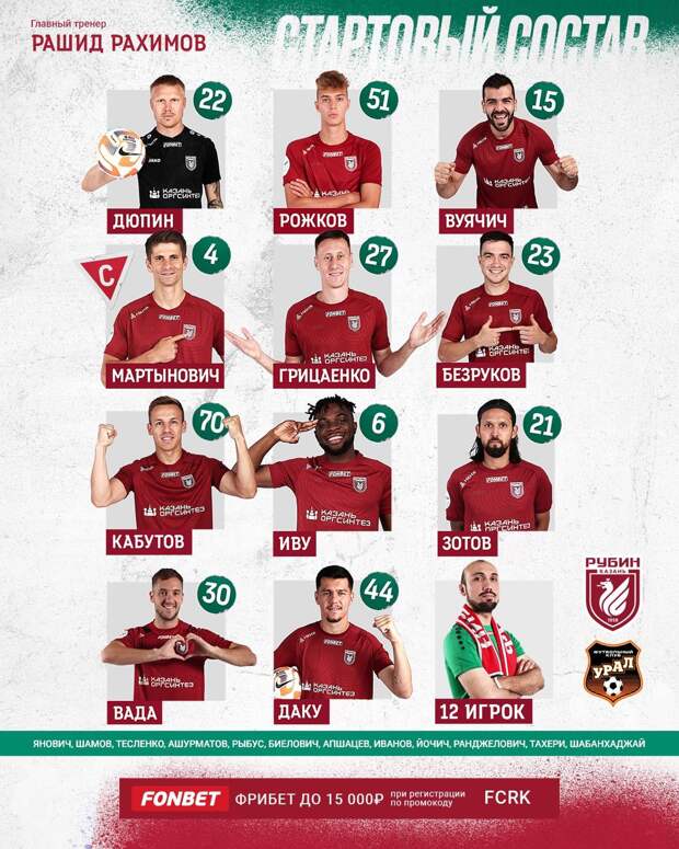 В составе «Рубина» на игру выйдут Дюпин, Рожков, Вуячич, Мартынович, Грицаенко, Безруков, Кабутов, Иву, Зотов, Вада и Даку.