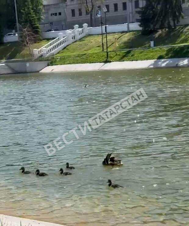 Очевидцы засняли, как на Черном озере в Казани утка и селезень учат плавать своих малышей.