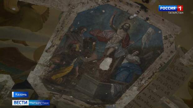 Из-под портрета юного Иисуса, написанного в 90-х, пробивается фреска 18 века, иллюстрирующая воскресение Спасителя. Сейчас сюжет можно разглядеть целиком. Обнаружили мазки прошлого случайно – при изучении слоев красок перед началом реставрации храма. Восстанавливать сокровище начали сразу же.«Это очень сложный, тяжелый труд, на самом деле. Я сам не художник-реставратор, но я как-то тут пытался с ними постоять на лесах. Небольшой строительный объем расчищенной живописи три художника-реставратора потихонечку делали шесть месяцев», — говорит главный инженер Казанской епархии, Михаил Федотов.