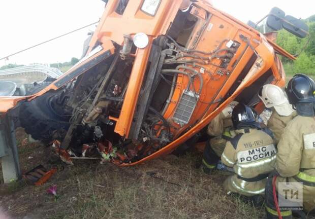 Очевидцы рассказывают, что спасатели доставали водителя КАМАЗ с помощью автокрана.