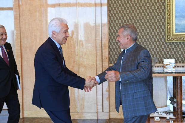 С руководителем фракции «Единая Россия» в Государственной Думе Федерального Собрания РФ, председателем общероссийской общественно-государственной организации «Ассамблея народов России» Владимиром Васильевым встретился Раис Татарстана Рустам Минниханов. Встреча прошла в Доме Правительства РТ. Об этом сообщили в пресс-службе Раиса РТ