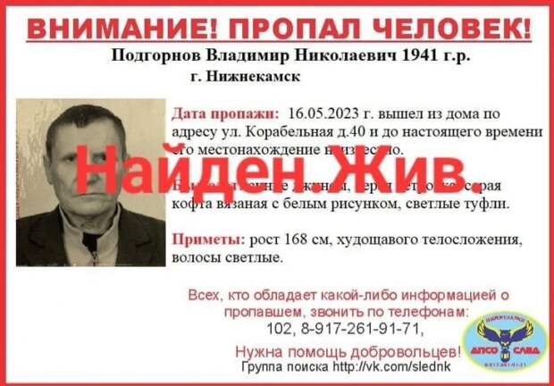 В Нижнекамске нашли пропавшего 82-летнего пенсионера. Об этом сообщает поисковый отряд «След» в своем сообществе.