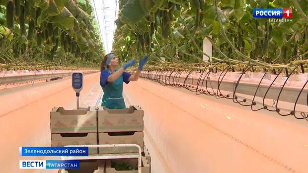 Комбинат выращивает овощи на основе светокультуры, и уже несколько лет может полностью обеспечивать себя собственной энергией. Это, конечно, сказывается и на себестоимости продукции. Масштабы хорошо видны с высоты птичьего полета. На площади почти в 40 гектаров за прошлый год собрали 43 с половиной тысячи тонн овощей – томатов, салата, перца. Львиная доля – это огурцы. Плантации поделены звенья. В свою очередь звенья – на участки. В каждом звене урожай собирают примерно 10 мастеров-овощеводов. Наталья Сагирова – тепличница с большим опытом и всегда с хорошим настроем.