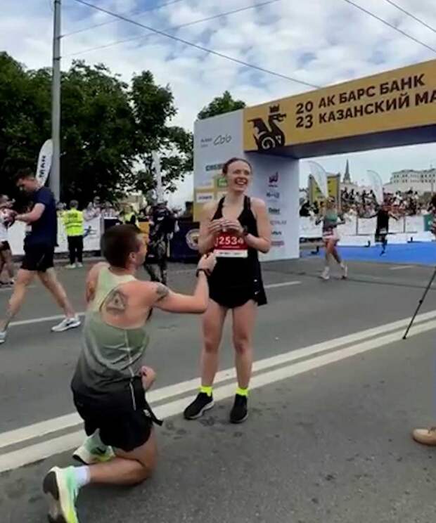 Участник «Казанского марафона» сделал предложение руки и сердца девушке сразу после забега — на финише. Кадры распространились в соцсетях.